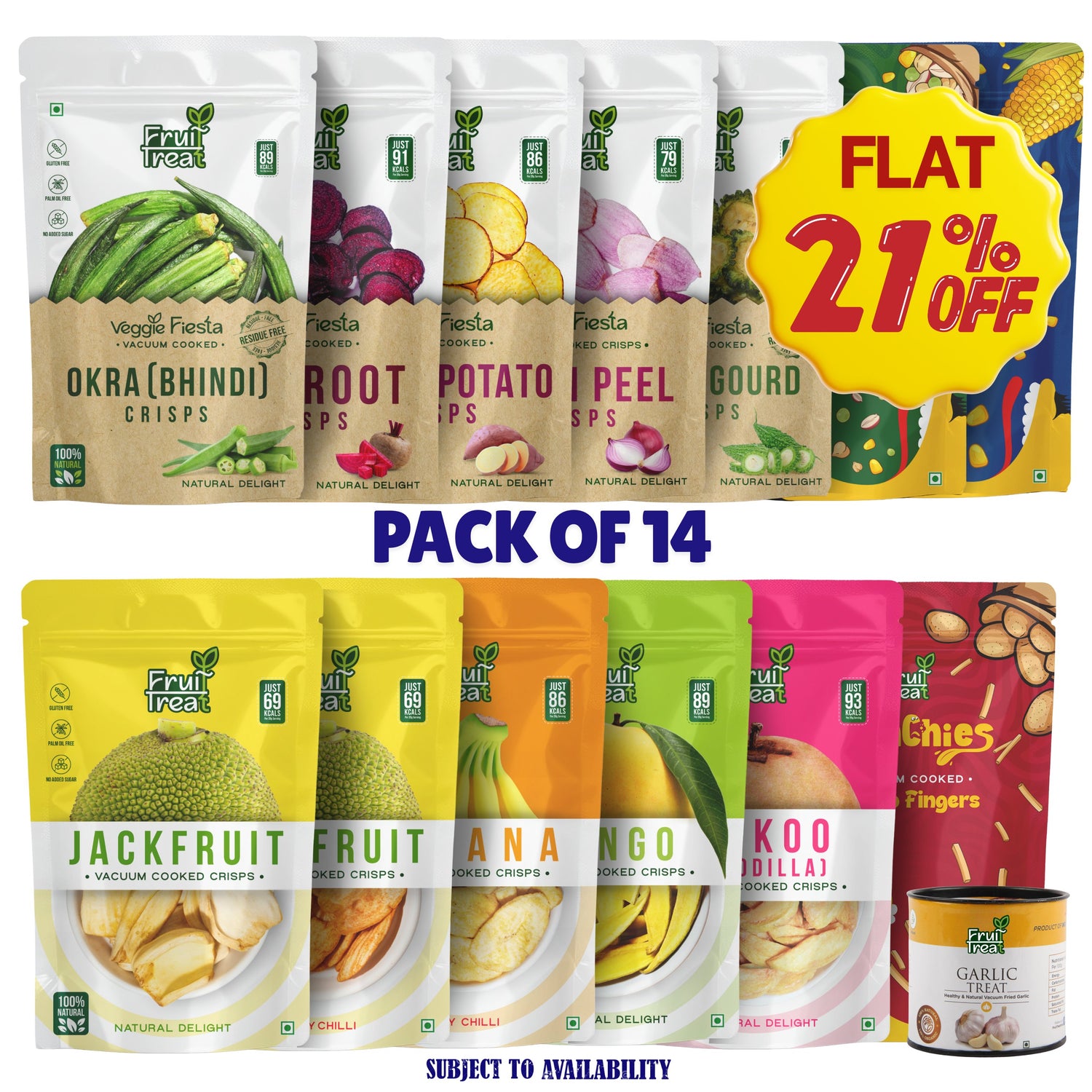 Unveiling Nature's Treasures: At Fruittreat, authenticity reigns supreme. These bewitching chips and snacks are crafted from a diverse assortment of fruits plucked straight from nature's pantry. Each fruitβwhether it be the luscious Chickoo, the delightful banana, the spirited Kabuli Channa, the sweet potato sensation, the bold bitter gourd, or the mystical bhindiβpossesses its own unique tale, waiting to be savored in every bite.