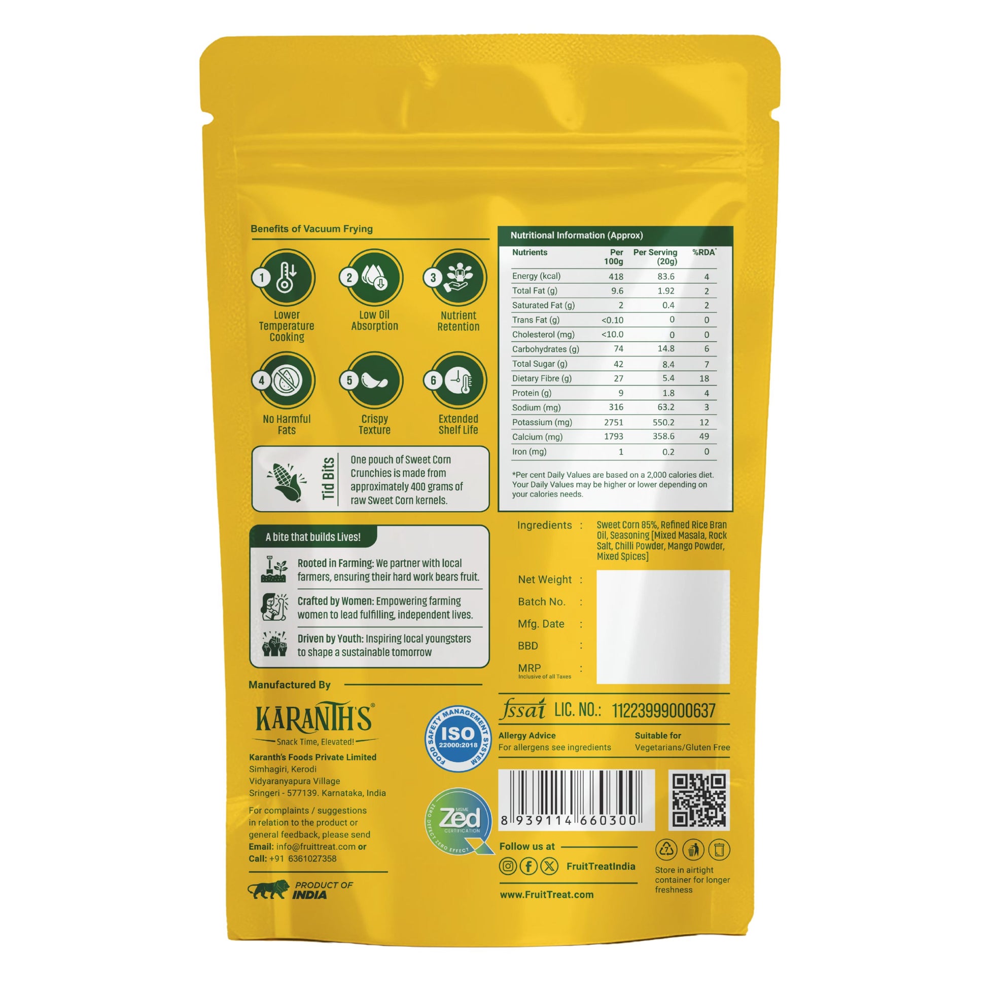 100% Healthy Snack: Made from fresh sweet corn kernels, vacuum fried for a crispy snack.